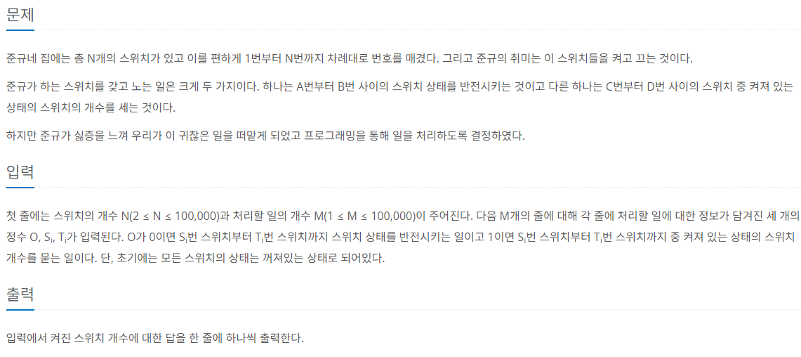 세그먼트 트리를 연습하면서 문제를 도전했다. 아직 완벽히 내 것으로 만든 알고리즘이 아니라서 사소한 실수를 많이 했다.