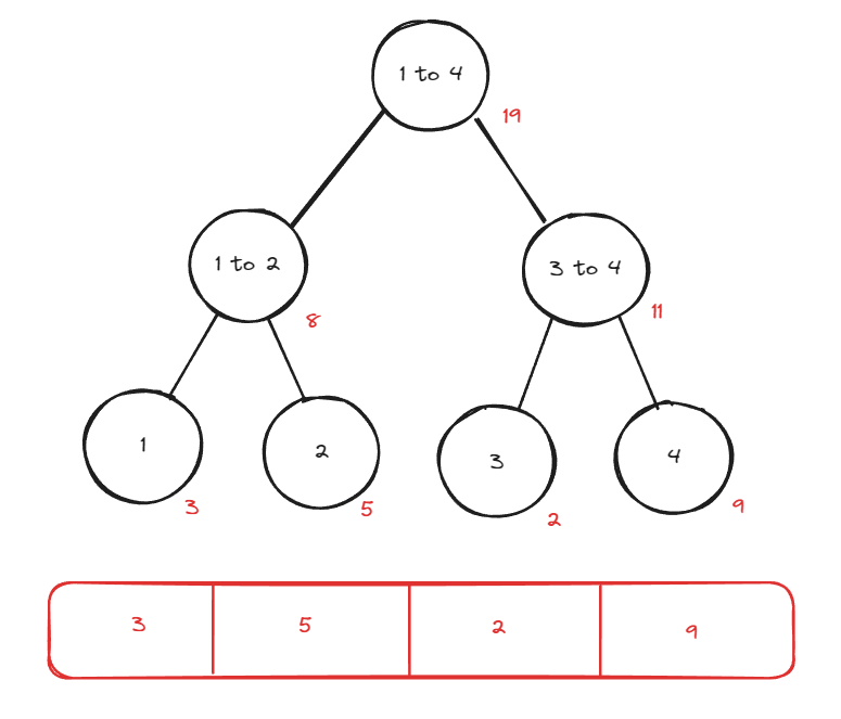 트리에는 특정 범위에 계산된 결과가 이미 계산되어 있어서 트리를 사용하면 어떤 범위의 누적합이든지 O(log N)의 시간 복잡도로 찾을 수 있다.