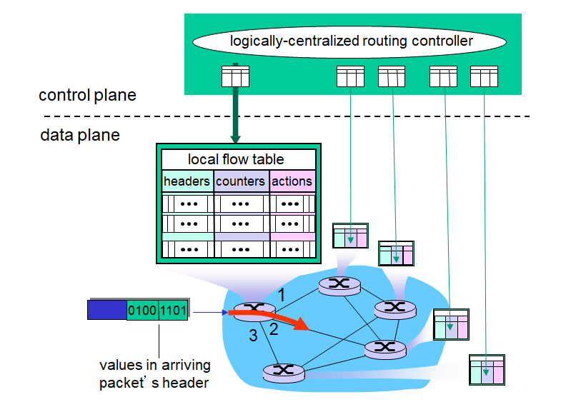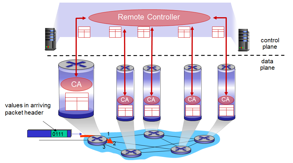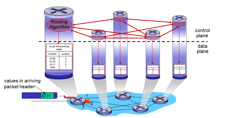 네트워크 제어 평면 역할 : 데이터그램이 송신 호스트에서 목적지 호스트까지 달 전달되게끔 로컬(local), 퍼 라우터(per-router)포워딩을 조정하는 것