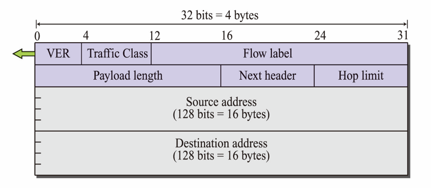 - 트래픽 클래스 (Traffic class) : IPv4의 TOS 필드와 비슷한 의미로 만든 필드는 흐름 내의 smtp 이메일 같은 애플리케이션의 데이터그램보다 voice-over-IP 같은 특정 응용 데이터그램에 우선 순위를 부여하는데 사용