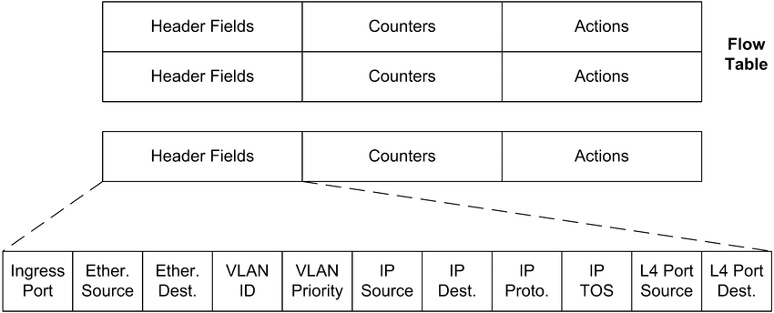 - 각 플로우 테이블 항목에는 관련 우선 순위가 있어 여러 플로우 테이블 항목과 일치하면 우선순위를 따져 패킷의 액션이 정해진다.