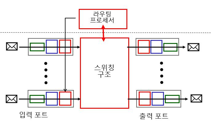 - 스위칭 구조 : 스위칭 구조는 라우터의 입력 포트와 출력 포트를 연결한다. 스위칭 구조는 라우터 내부에 포함되어 있다.