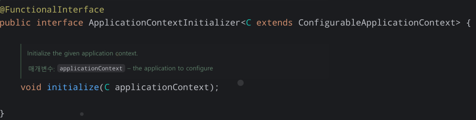 해당 인터페이스를 보면 initialize 함수를 구현하도록 정의되어있다. 그 함수의 파라미터로 ApplicationContext를 입력받는데 바로 이 context가 스프링이 관리하는 context이고 해당 context에 원하는 설정을 주입하는 로직를 구현할 수 있다!