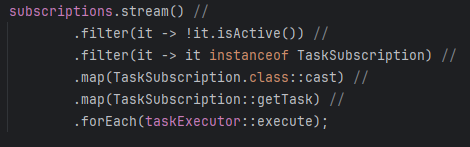 그렇다면 이런 기본 설정을 사용하였을 때, 최대로 생성이 되는 스레드의 수를 알아보기 위해서 더 코드를 살펴보았는데 결론은 구독의 개수만큼 스레드가 최대로 생성될 수 있다는 것이다. 왜냐하면 구독이 isActive 메서드에서 구독 상태가 활성화되었을 때만 Executor에 새로운 작업을 등록하는데 isActive 함수는 현재 실행하는 Task가 실행 상태이라면 false를 반환하기 때문에 실행 중인 구독은 새로운 작업을 등록할 수 가 없다. 따라서 최대로 생성할 수 있는 스레드는 구독의 수와 일치하다는 것을 알 수 있었다.