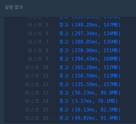 그러나 실행 결과가 다른 사람들의 결과보다 조금 시간이 걸리는 것을 보면 효율성을 생각했을 때는 다른 방식이 좋겠다는 생각을 한다. 그래도 가독성 좋게 코드를 작성해서 다른 코드보다 이해하기 쉽고 구현하기도 좀 더 수월하지 않을까?