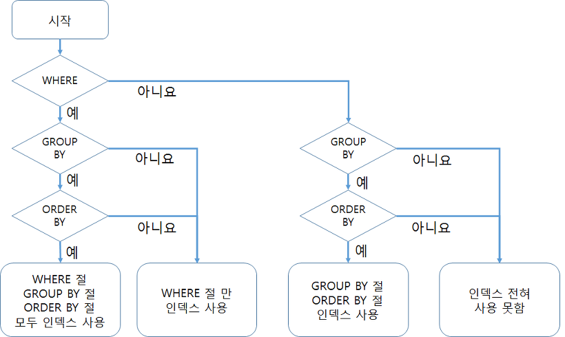 - GROUP BY 절에 명시된 칼럼의 순서가 인덱스를 구성하는 칼럼의 순서와 같으면 인덱스를 사용할 수 있다.